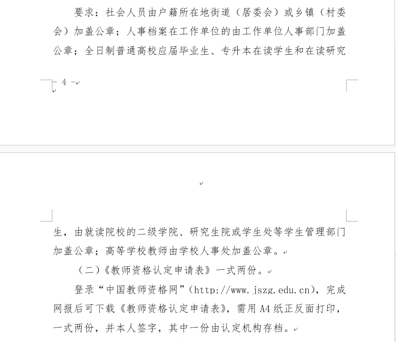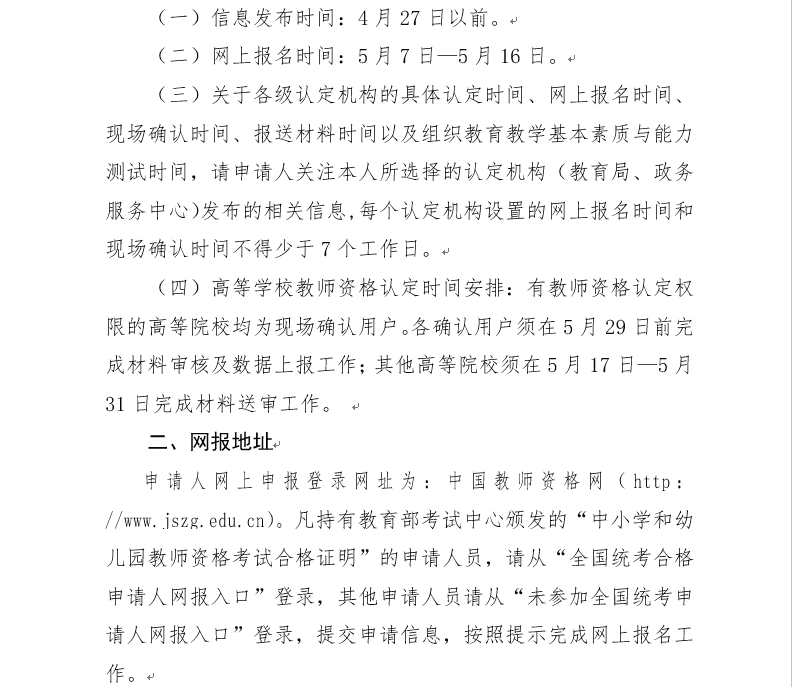 1、网上报名开始时间为5月7日,报名截止时间为5月16日。请申报高校教师资格证的人员自助网报,完成网报后,将《教师资格认定申请表》下载,用A4纸正反面打印,一式两份,在“本人签字”栏签名。为保证后期资料汇总、公示及送审工作顺利进行,请申报系、处、部依照“附件二”的时间要求,将申报材料统一交到人事处811室。